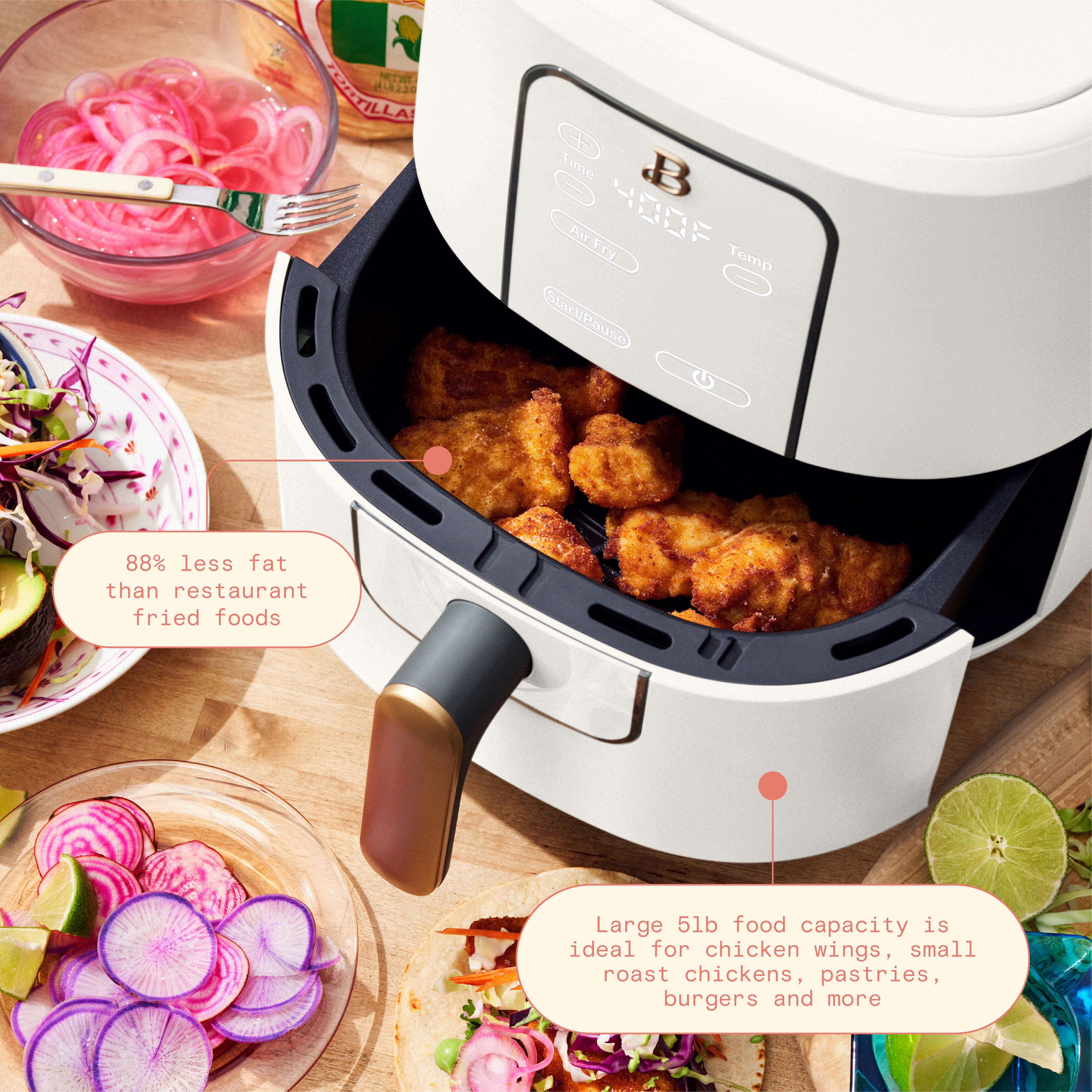 Our signature touch-activated display illuminates only when you need it. No dials, buttons or knobs.Powerful 1700w system with stainless steel provides faster heat-up and cool-down times.High Performance Circular Heat Technology and nonstick crisping tray promote fast, crispy, evenly-cooked meals.Large 5lb (2lb French fry) food capacity is ideal for chicken wings, small roast chickens, pastries, burgers and more.Air fried favorites have 88% less fat and 65% fewer calories than restaurant-fried foods.60-minute automatic shut-off function adds safety and peace of mind.Removable crisping tray and pan are dishwasher safe and PFOA/PFOS-free for fast and easy clean-up.