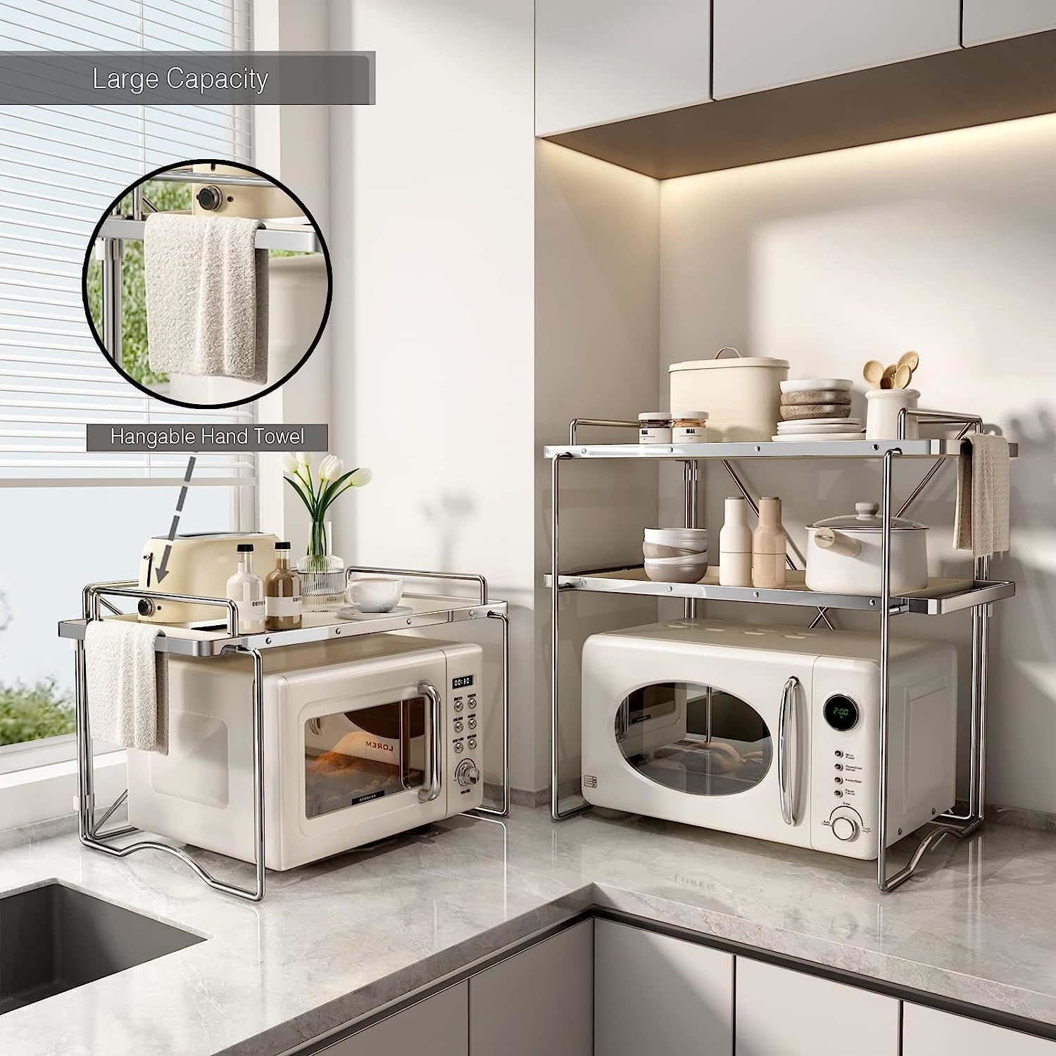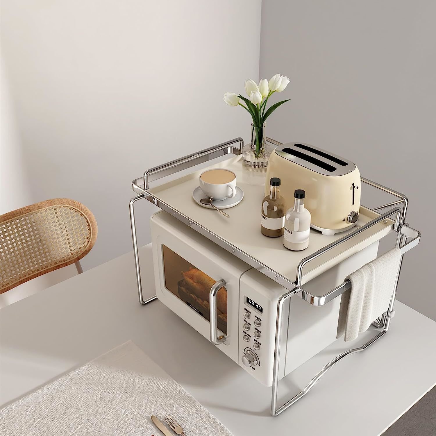 Towel HolderThe handle of the serving tray is also a towel holder, you can hang the dish rag and hand towels on it.Smooth Surface & Rounded CornerThe microwave shelf is made of high-quality stainless steel with an elegant modern design. a smooth surface and rounded corners keep it beautiful while protecting you from scratches.High-quality stainless steel structureThis microwave stand is made of stainless steel, is sturdy, and has no rust. it has a superb load-bearing capacity and Can hold up to 50 lbs.