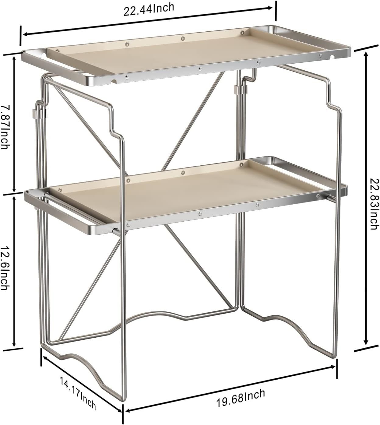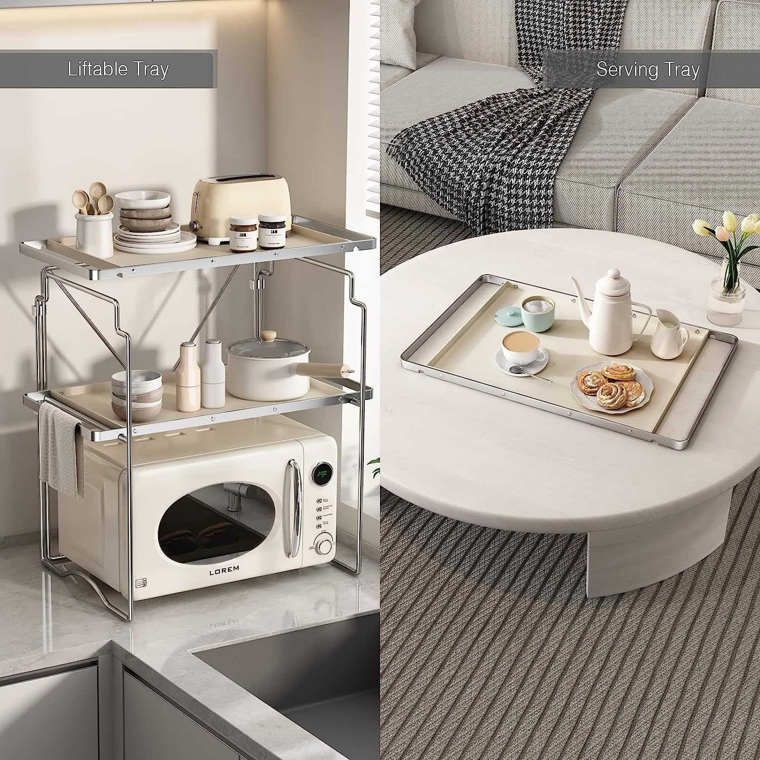 It is not just a microwave rack, the top shelf is also a food serving tray.It's also a beautiful countertop organizer. you can put it in the kitchen to organize your microwave oven, air fryer, toaster, spices, pots and pans, bowls, etc.