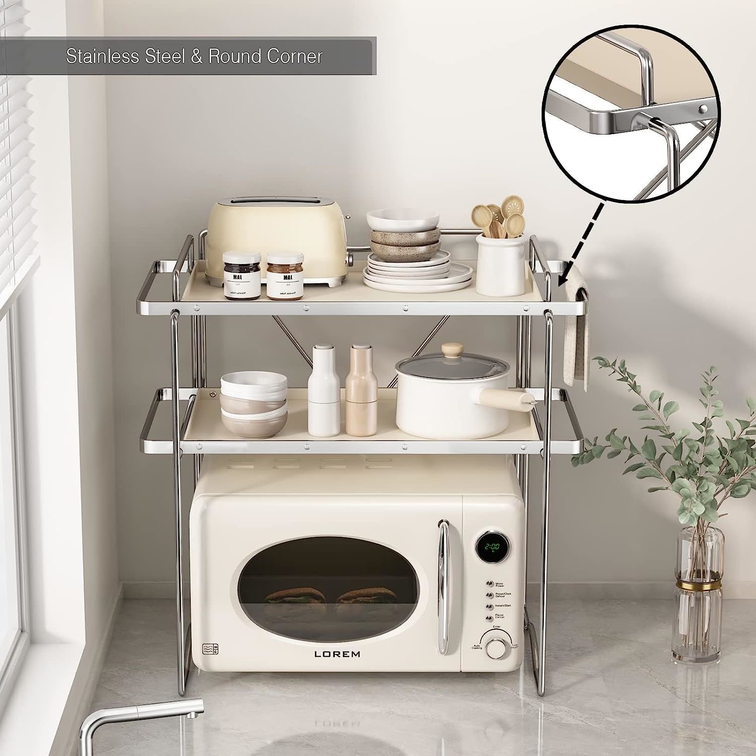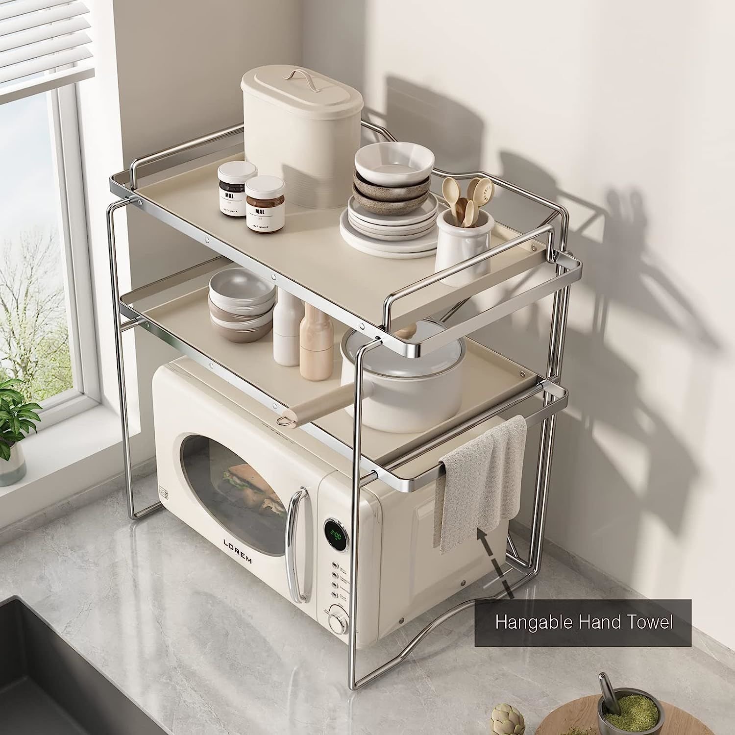 Towel HolderThe handle of the serving tray is also a towel holder, you can hang the dish rag and hand towels on it.Smooth Surface & Rounded CornerThe microwave shelf is made of high-quality stainless steel with an elegant modern design. a smooth surface and rounded corners keep it beautiful while protecting you from scratches.High-quality stainless steel structureThis microwave stand is made of stainless steel, is sturdy, and has no rust. it has a superb load-bearing capacity and Can hold up to 50 lbs.