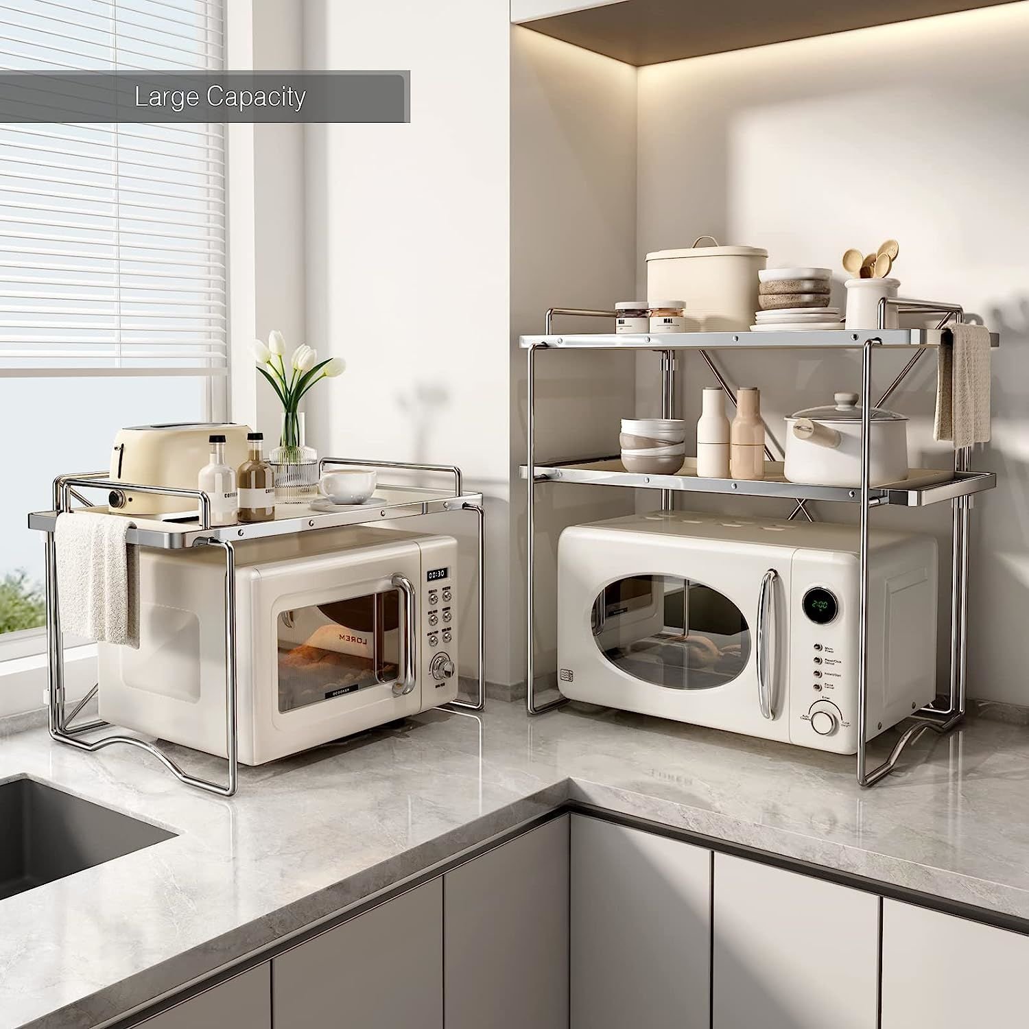 Our microwave rack is an extra large storage space design, and we offer 2-tier and 3-tier for you to choose from. It can store your microwave, oven, air fryer, toaster, spices, bowls, and many others. It‘s a great choice for your kitchen counter.