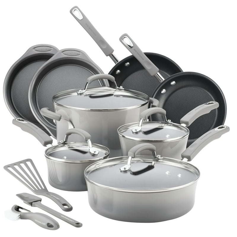 Cooks new and experienced alike will appreciate the essential pieces included in the Classic Brights Hard Enamel Nonstick 15-Piece Cookware Set with bakeware and kitchen tools. Whether your cooking tasks are simmering and searing or browning and baking, cookware gets the kitchen set. From the reliable cooking performance to the fun, contemporary colors and durable materials, the pots and pans in this collection can handle everyone's favorite dishes, and then some. Sturdy aluminum construction promotes even heating, helping to reduce hot spots that can burn foods, and the bold two-tone enamel cookware exteriors show plenty of stylish kitchen personality. hard enamel cookware features durable nonstick interiors that provide beautiful food release and make cleanup snappy. Oven safe to 350F, the cookware's comfortable grippy handles are double riveted for extra strength, and the shatter-resistant glass lids lock in heat and moisture. The cookware comes with two nonstick round cake pans that sport a solid pop of coordinating color and extra-large handles, and are oven safe to 450F. And the cooking tools included – two nonstick-suitable cooking spoons and Rach's clever Veg-A-Peel fruit and vegetable peeler – are smartly-designed so your cooking really cooks! Make, bake and share favorite foods and show off a lot of personality with the bold and contemporary Classic Brights Hard Enamel Nonstick 15-Piece Cookware Set.